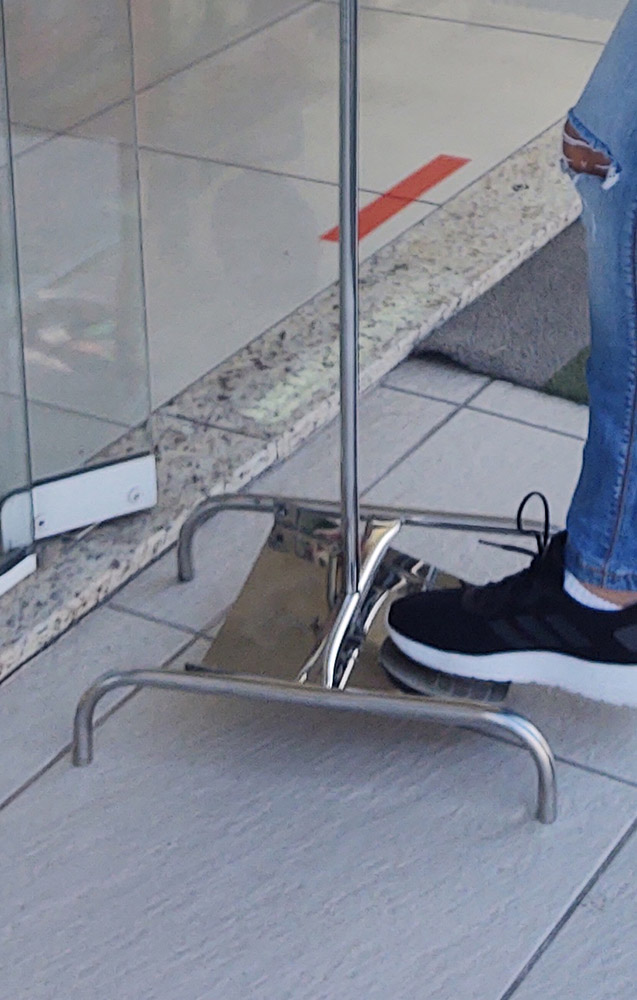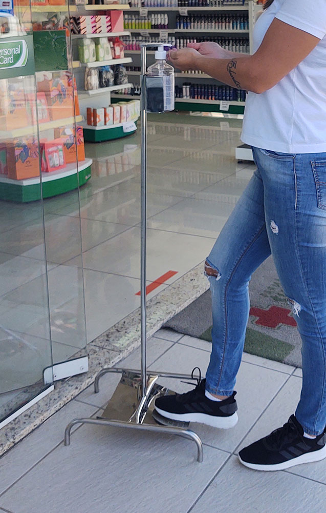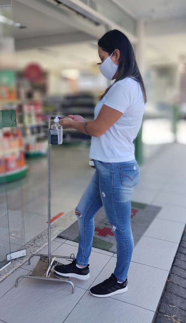 Basta acionar o pedal que o gel é aplicado diretamente nas mãos sem a necessidade de tocar em nada após a higienização.